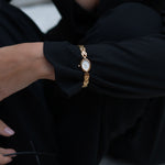 This petite women’s watch is designed to feel almost like a piece of fine jewelry. Its small, case and slender profile sit lightly on the wrist, while the ornate gold-toned links flow seamlessly. More like a bracelet than a traditional watch.